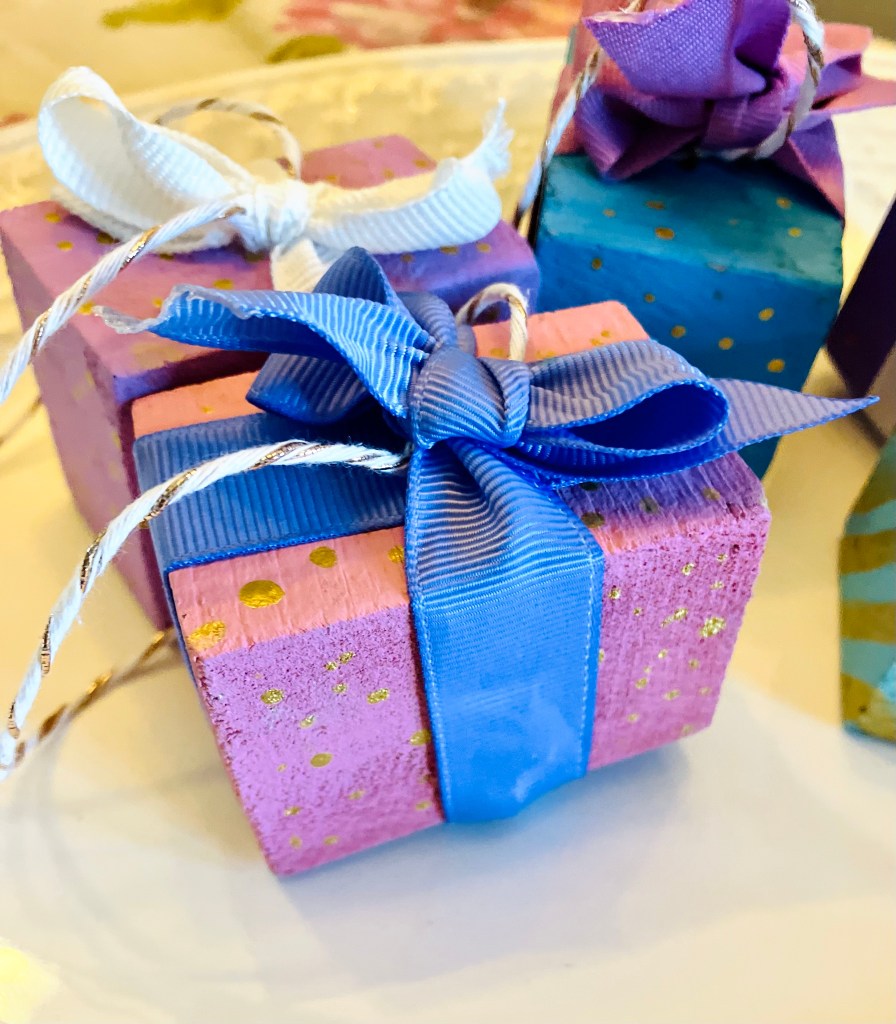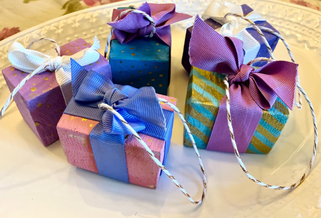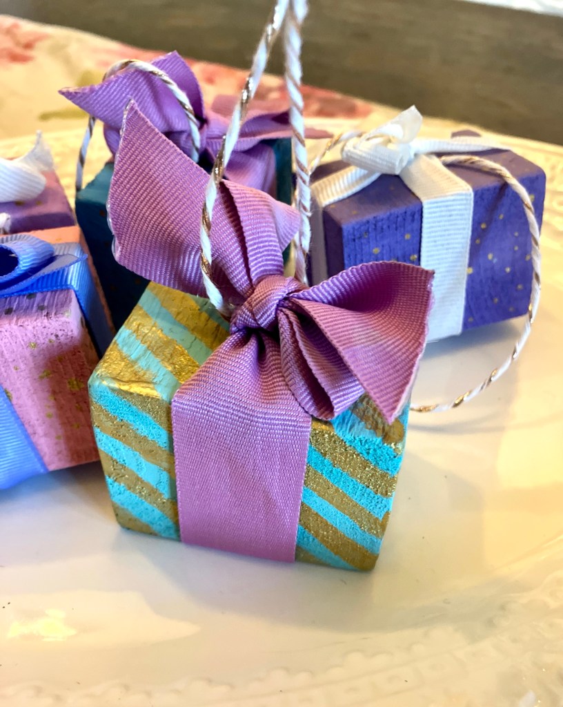 My daughter wanted to start making ornaments for gifts so after looking around we found scrap wood that we could cut into cubes, which became inspiration for these cute present ornaments!