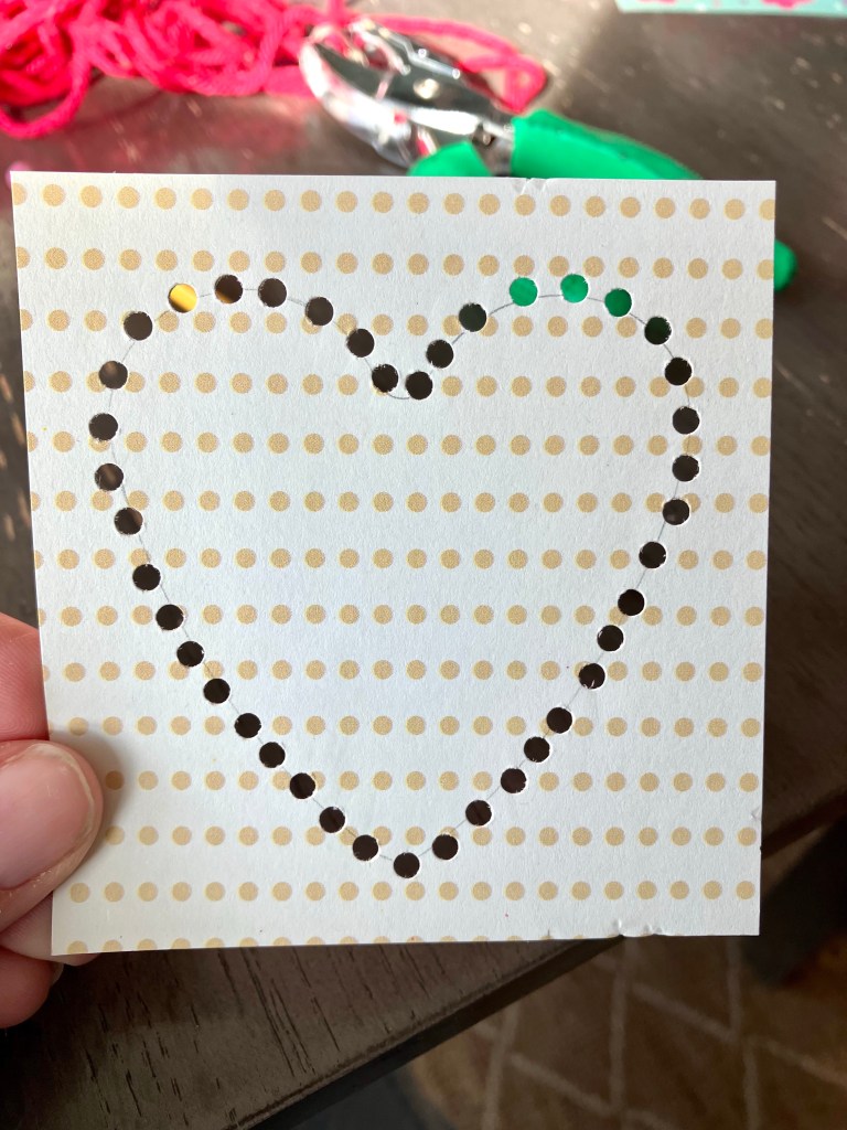 4. Using the hole puncher, punch holes all around the pencil line. The closer the better, but don’t get the holes too close together so they turn into one big hole!
